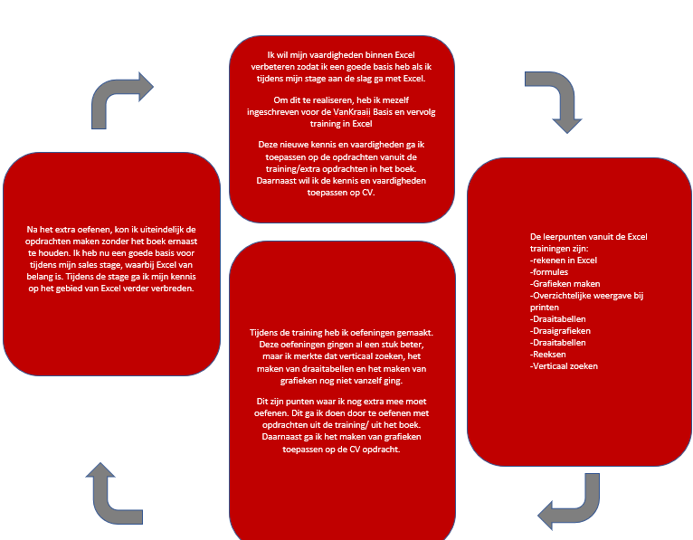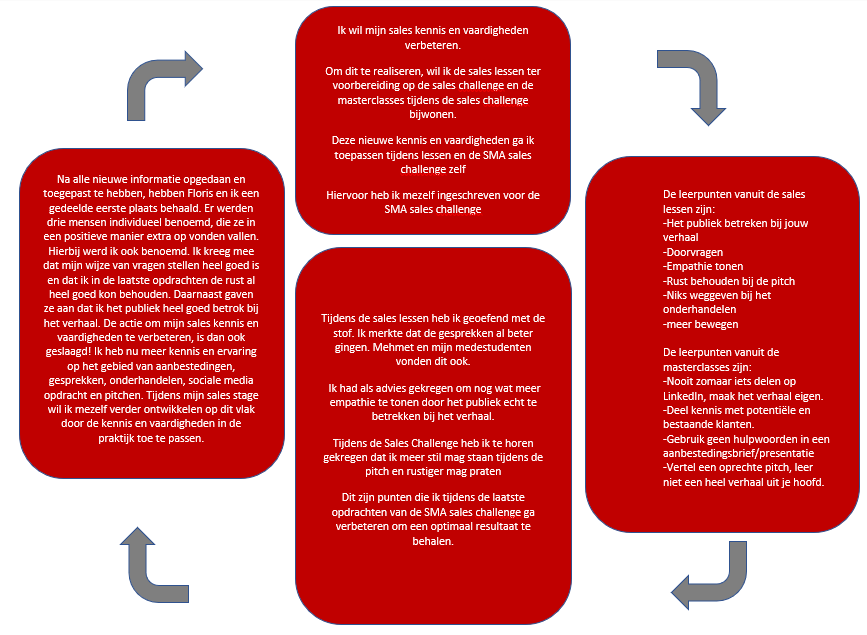 Reflectie op de actie: Door over de verschillende onderwerpen informatie op te doen en deze informatie gelijk toe te passen, merkte ik dat ik mezelf al aan het verbeteren was op de verschillende vlakken binnen mijn salesdoel. Hierdoor heeft deze actie een goede bijdrage geleverd aan het leerdoel.